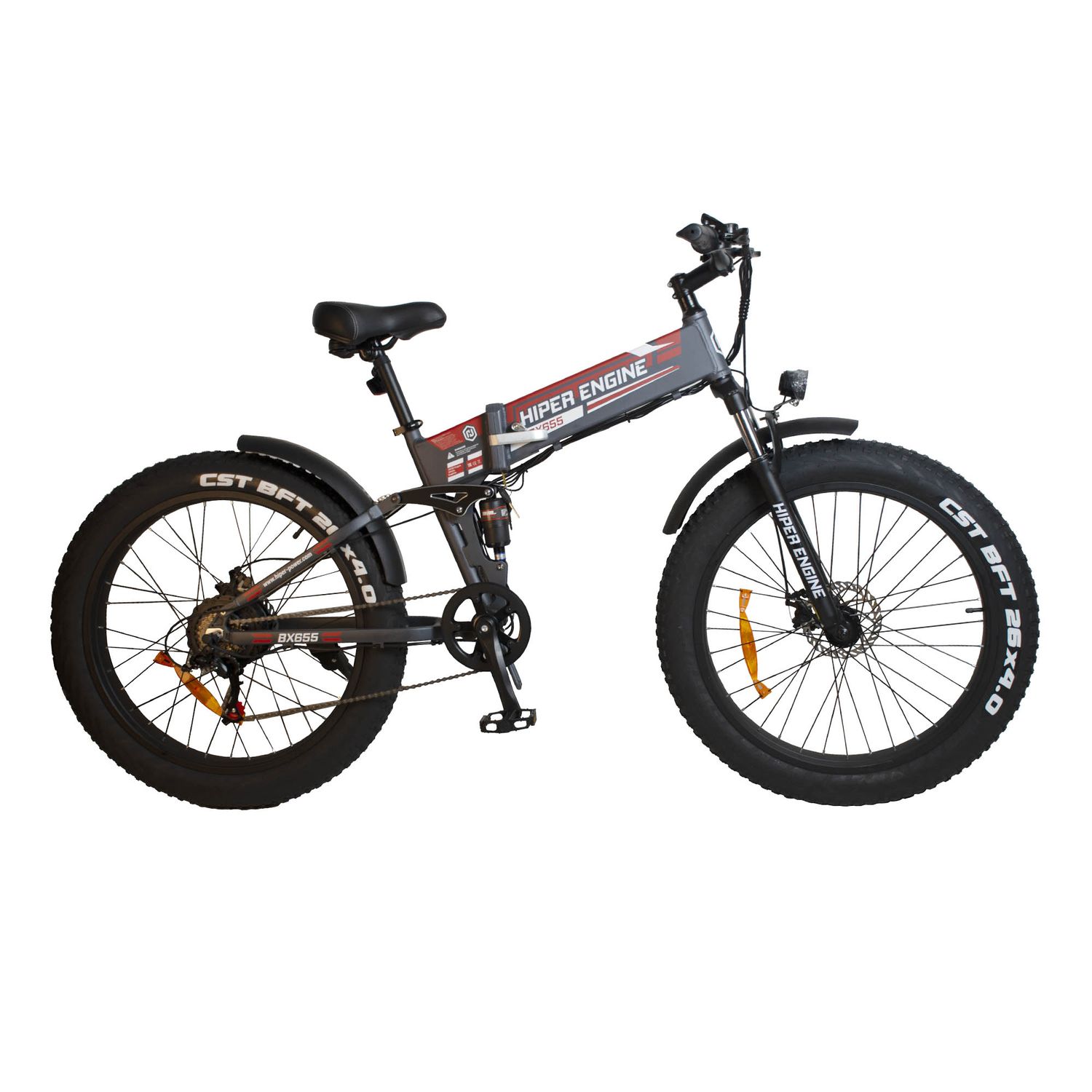 HIPER Engine BX655 - складной электровелосипед-фэтбайк с передней и задней подвеской. Колёса с прочными мягкими шинами диаметром 26х4.0 доставят удовольствие при поездках по грунтовым дорогам с песком и грязью. Наличие мощного мотора 500Вт48В позволяет реализовать большие прогулки как в условиях города, так и за пределами городских асфальтовых покрытий. Максимальный пробег модели составляет 45 км, для полной зарядки аккумулятора нужно 6-8 часов.