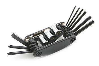 Компактный мультитул с набором шестигранников и накидных головок. Выполнен из стали с пластиковой рукояткой.