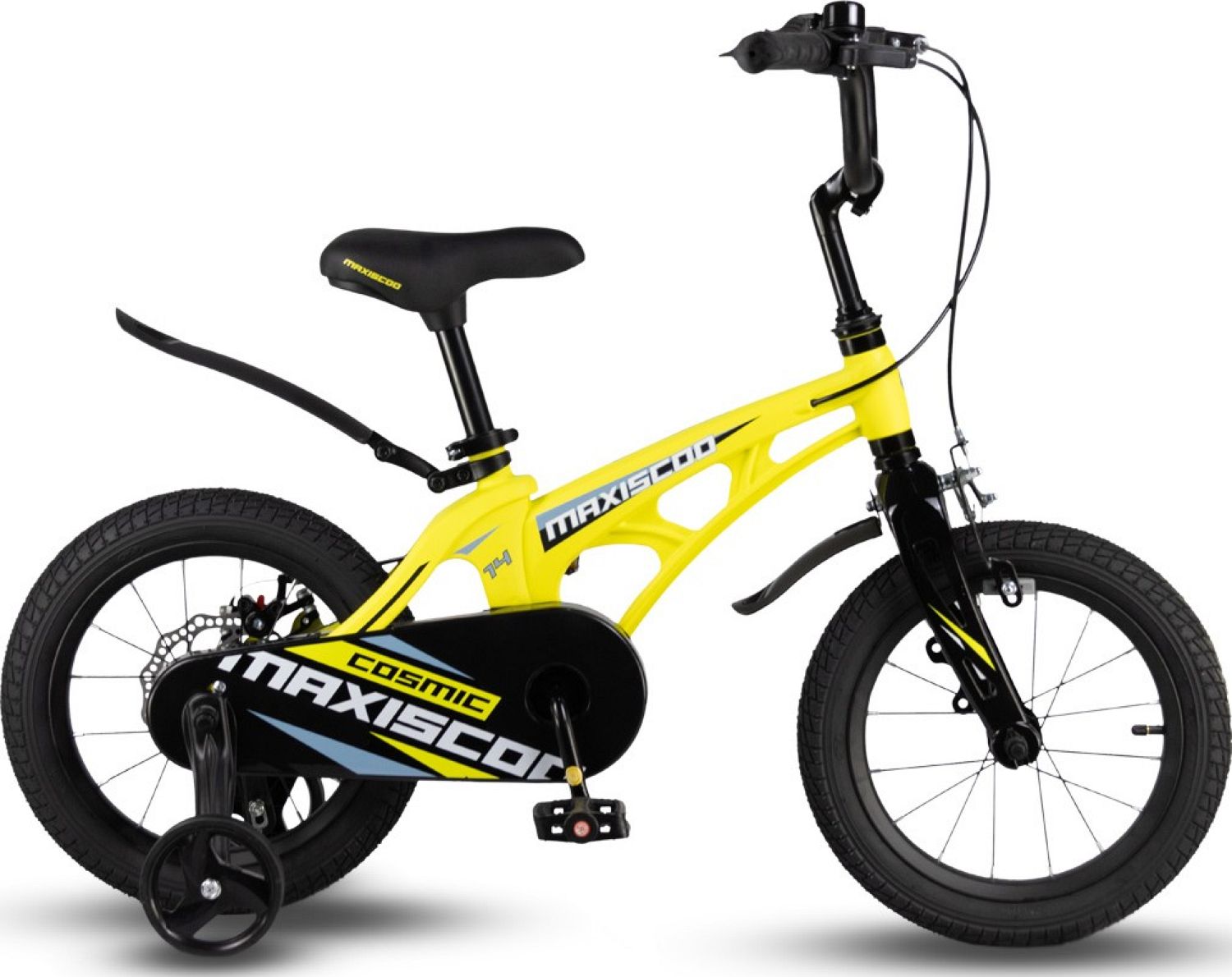 В комплекте с велосипедом идут боковые колеса, крылья и звонок, а также полная защита цепи. Это обеспечивает дополнительную безопасность и комфорт при езде, позволяя ребенку наслаждаться своими приключениями на велосипеде Maxiscoo COSMIC Стандарт 14" (2024).