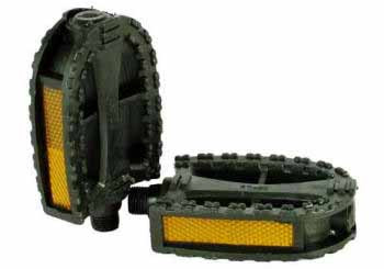 Черные пластиковые педали с катафотами для детского велосипеда.