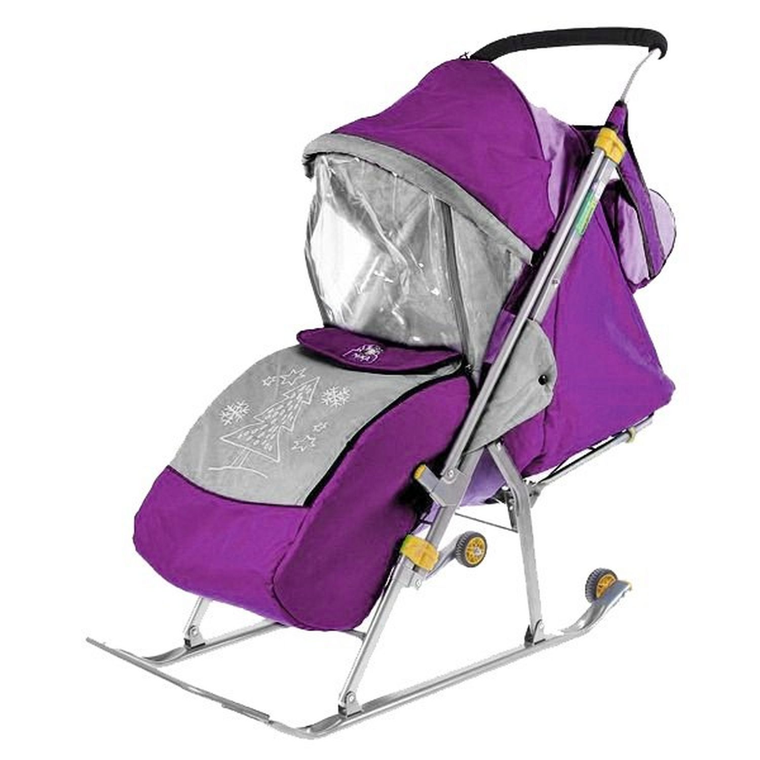 Санки-коляска предназначены для перевозки детей в положении сидя и лежа. Чехол выполнен из влагонепроницаемого износоустойчивого полиэстера. Прочный и легкий металлический каркас, легко складывается. Широкие полозья обеспечивают легкое скольжение по снегу.