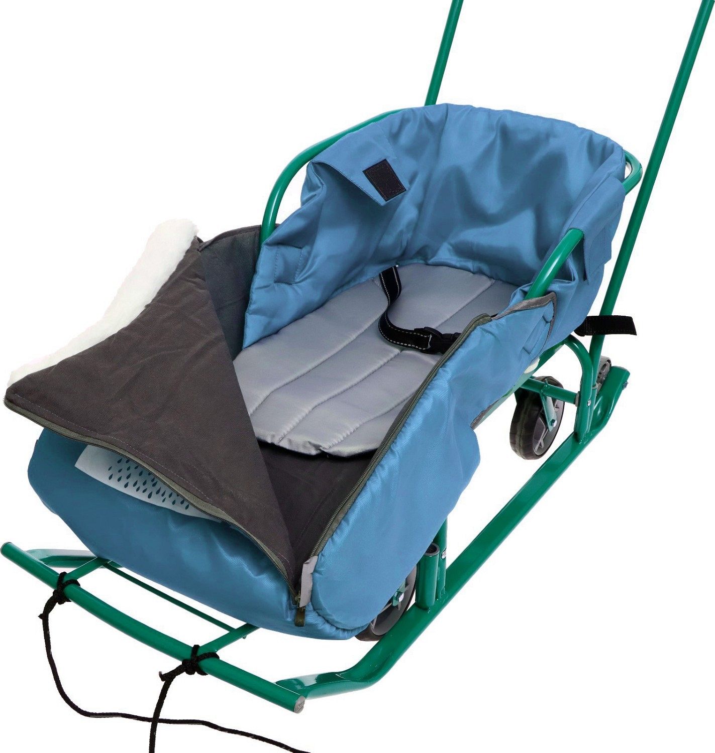 Плоские полозья способствуют отличному скольжению и набору скорости, что позволяет кататься как по снежным горкам, так и по льду и рыхлому снегу. Для дополнительного комфорта ребёнка предусмотрена ниша для ног с подставкой. Высокая ручка, регулируемая в двух положениях, обеспечивает удобство для того, кто толкает санки.