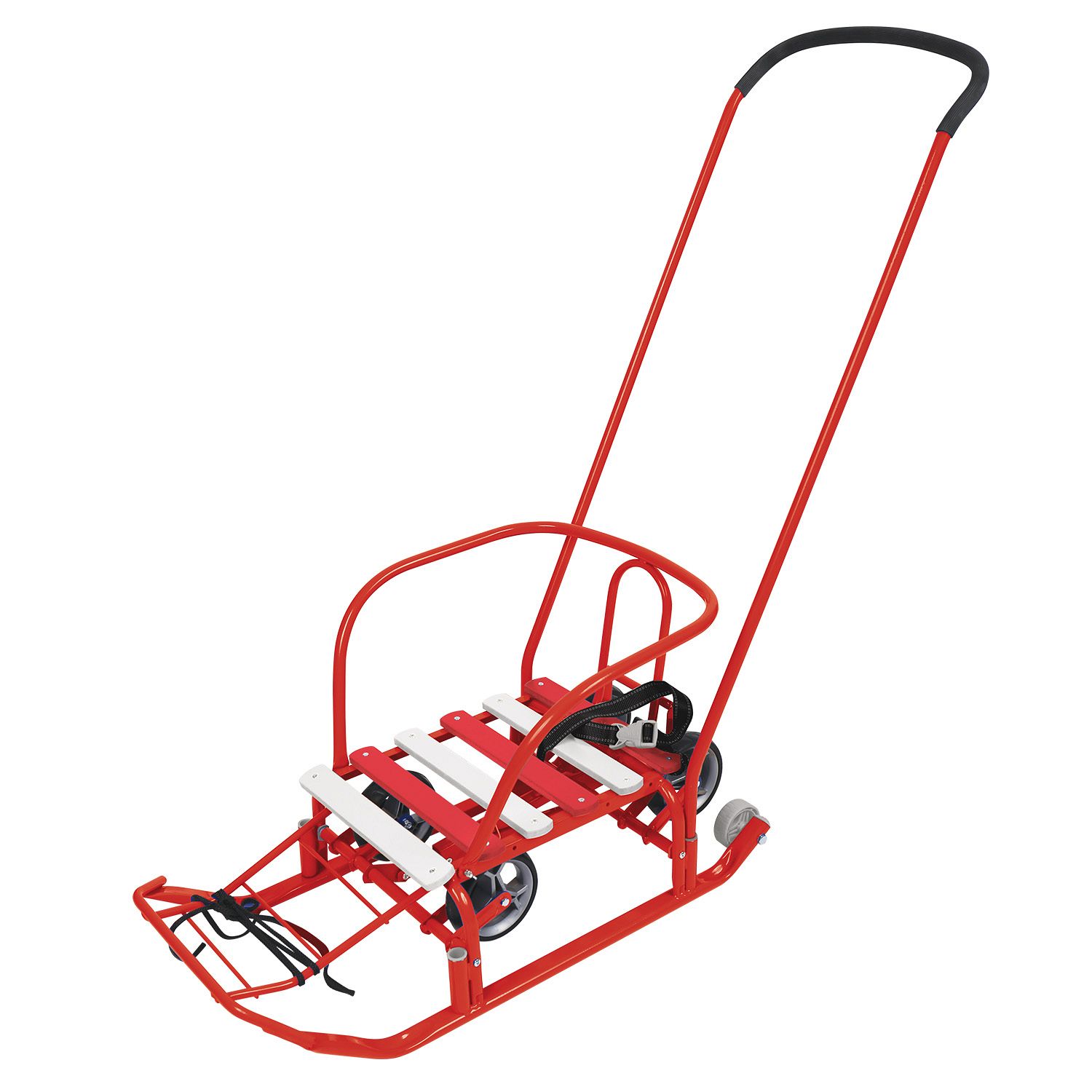 Яркие функциональные санки от российского производителя придутся по душе любому малышу. Они имеют прочный металлический каркас, удобную спинку и сиденье из деревянных реек. Впереди имеется подставка для ног. Санки можно доукомплектовать мягким сиденьем. Также санки комплектуются веревкой, чтобы возить за собой. Компактные размеры позволяют хранить их даже в небольшом шкафу. Имеется съемная родительская ручка, которую можно поставить в двух положениях. Откидные колеса позволят беспрепятственно преодолевать бесснежные участки дороги.