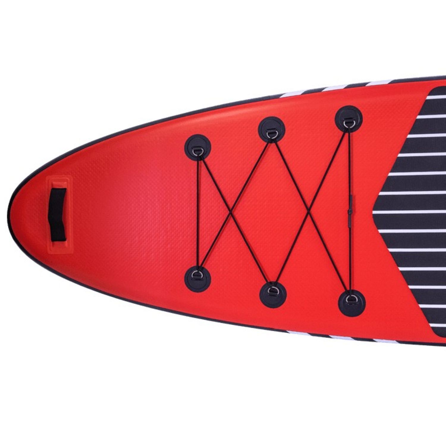 Шеститочечная карго-система (багажник) в носовой части надежно удержит груз на волнах. Дно сапборда и боковые края выполнены в практичном черном цвете. В передней нижней части доски размещено дополнительное D-кольцо, позволяющее швартовать его у берега или выполнять буксировку по воде. Переноску накачанной доски делает удобнее дополнительная ручка на носу. Насос двойного действия позволит быстро и компактно собрать сапборд в рюкзак после отдыха.