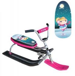 Снегокат Dream Team Betty 118 - классическая модель с велорулем. Разборная рама из стали хром. Дизайн с розовой передней лыжей и милой девочкой на сиденье. Снегокат оборудован пластиковыми лыжами. Ножной тормоз позволит контролировать скорость спуска. Грузоподъемность достигает 100 кг. Детский снегокат имеет мягкое сиденье и мягкую защиту на руле. Особенности Рама из стали, выкрашенная под хром. Ножная тормозная система. Пластиковые лыжи, прочные и устойчивые к низким температурам. Велоруль с защитой по центру. Мягкое сиденье с рисунком девочки.