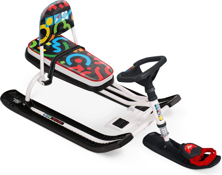 В комплект входит набор наклеек, с которыми можно придать снегокату индивидуальный облик. Надёжная конструкция и устойчивые широкие полозья делают катание ещё веселее и безопаснее.