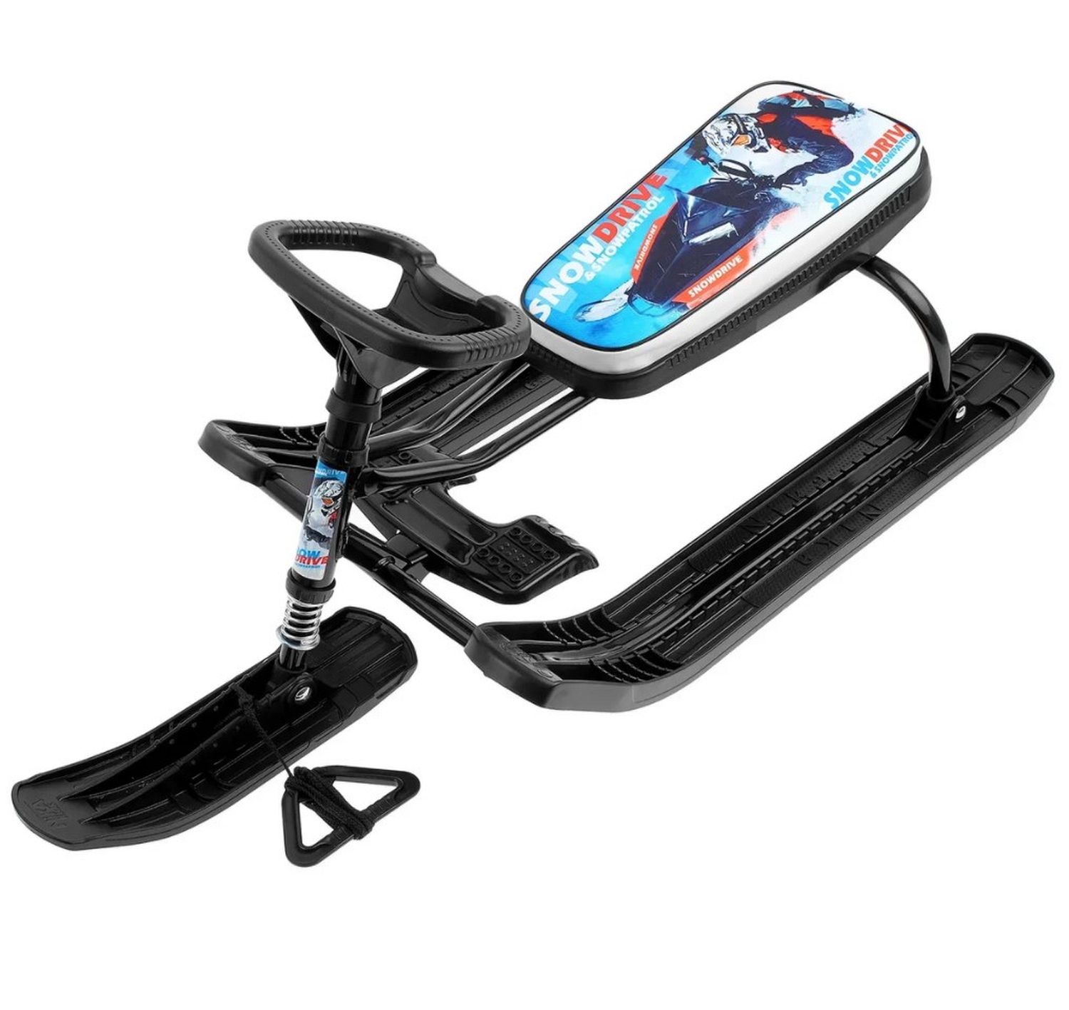 Классический снегокат с усиленным тормозом оценят и дети, и взрослые. Это и отличный способ семейного отдыха. Яркая маневренная модель придется по душе любому ребенку. Она имеет прочный металлический каркас, удобное сиденье и классическое расположение полозьев. Ребенок может управлять движением снегоката при помощи руля, который направляет ведущую переднюю лыжу. Также имеется прочная веревка с удобной пластиковой ручкой, при помощи которой снегокат легко перемещать. Снегокат имеет мягкое сиденье с принтом.