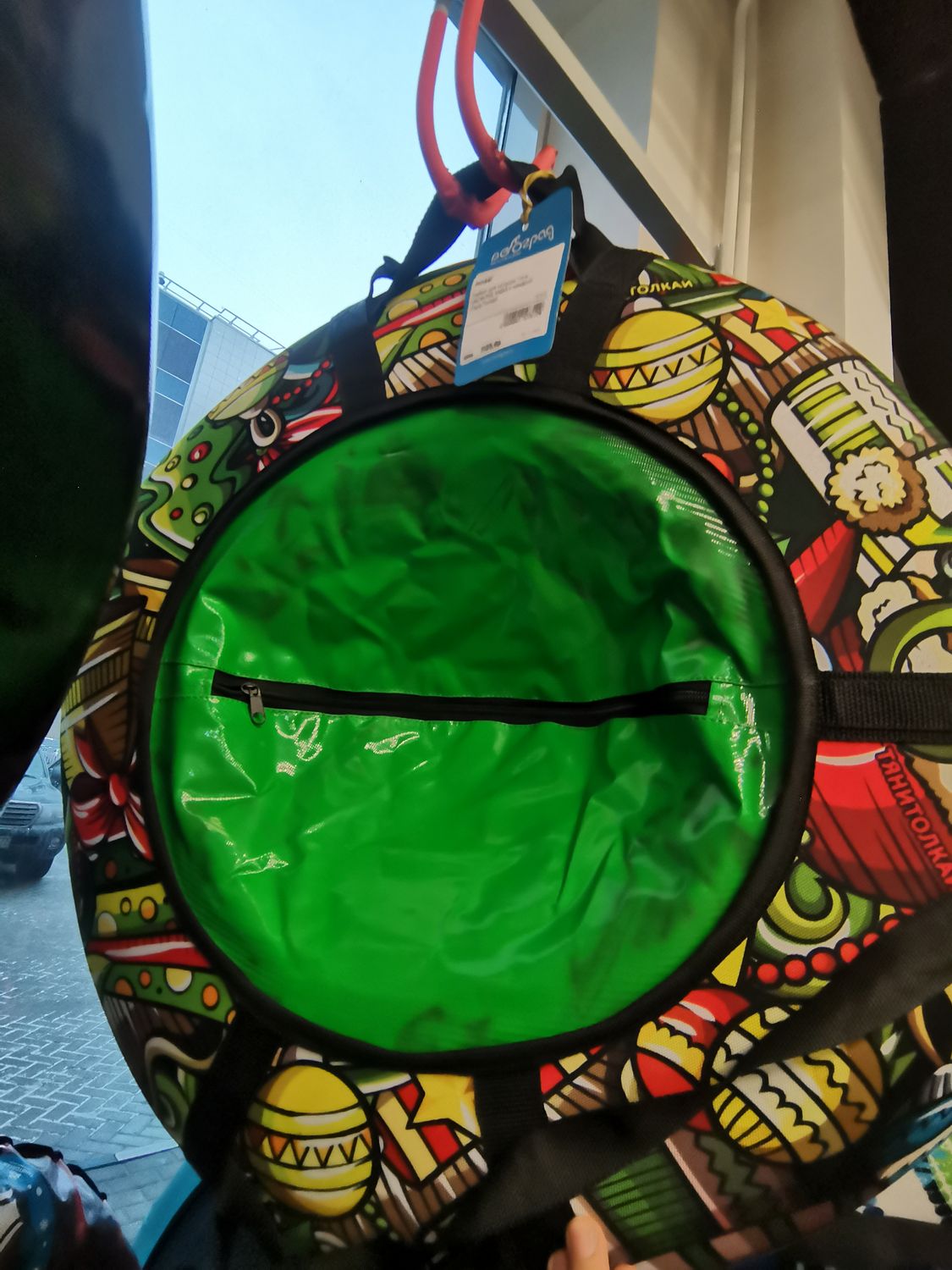 Тюбинг укомплектован усиленной автомобильной камерой. Для более комфортной езды имеются ручки-держатели по обеим сторонам тюбинга. Предусмотрен так же и буксировочный трос. Максимальный вес пользователя 35 кг.
