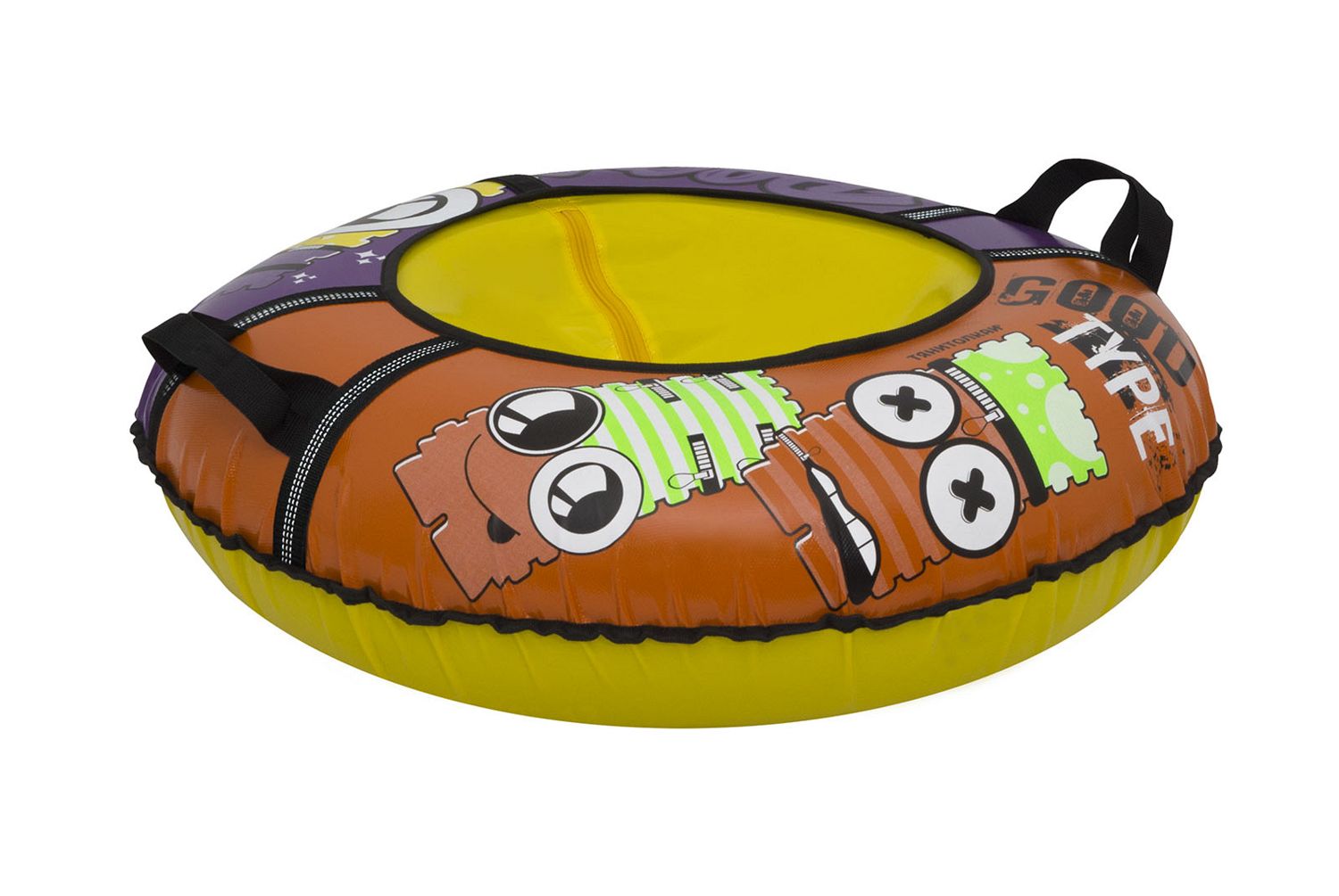 Тюбинг-ватрушка ТЯНИТОЛКАЙ изготовлен из прочного тента, который устойчив к морозам до 25 градусов, глянцевая поверхность материала позволяет тюбингу-ватрушке отлично скользить по снежной поверхности.